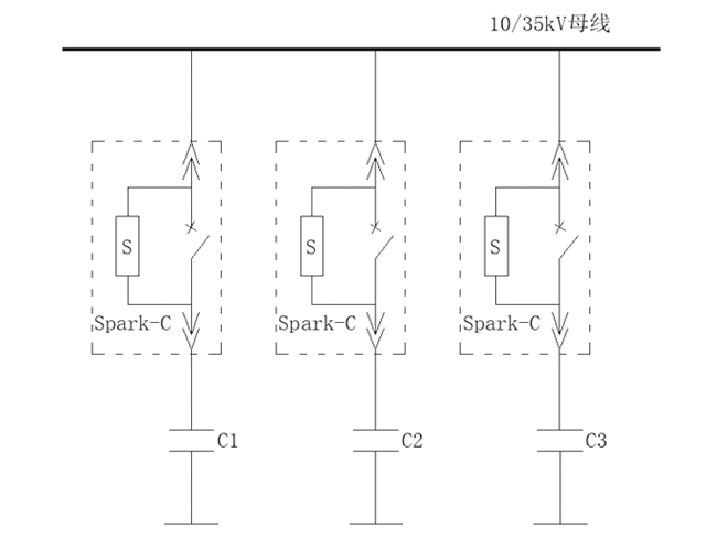 并联补偿电容器组投入时产生高达10~20倍合闸涌流,大幅缩短电容使用寿命;分闸时断路器重燃产生高达6~7倍过电压,严重影响系统运行和设备安全。10kV Spark-C相控柜提供优异的单组电容器/背靠背电容器组投切解决方案,适用于工业及电力系统的无功补偿系统,如下图。